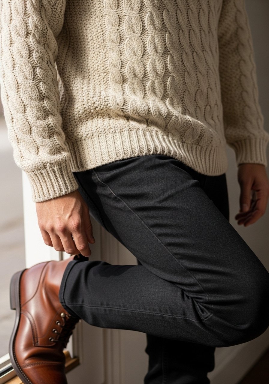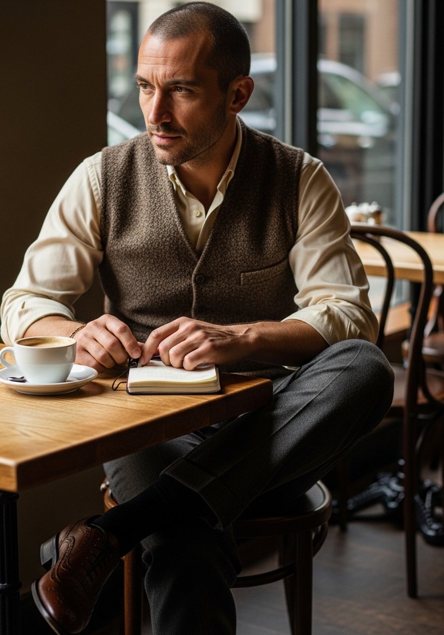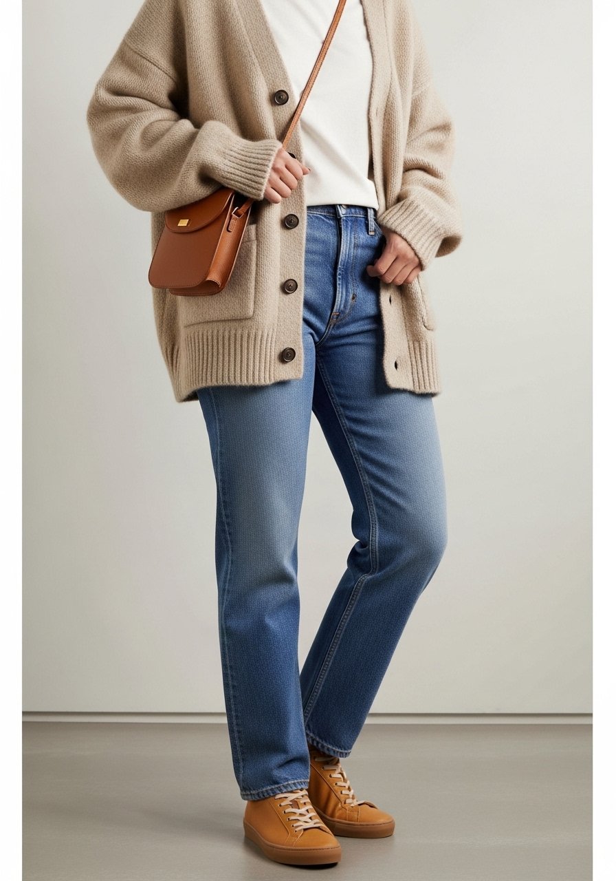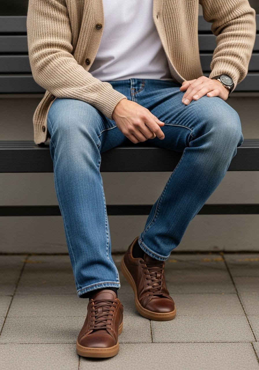 If I’m in a sweater or open blazer, I’ll reach for clean white sneakers. If I want a smarter read, I put on brown derby shoes. The shoes shift the whole outfit’s tone instantly; they anchor how others will read the look.
