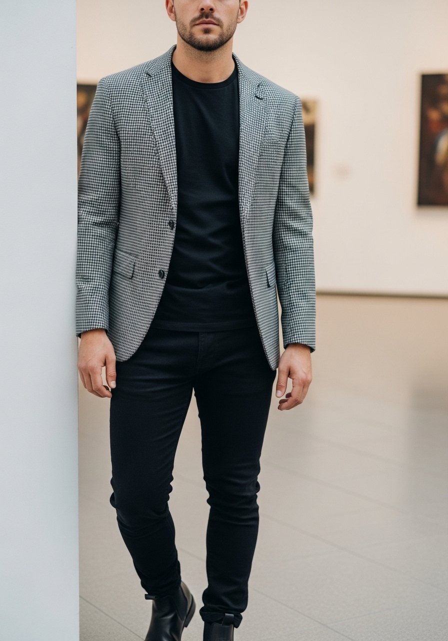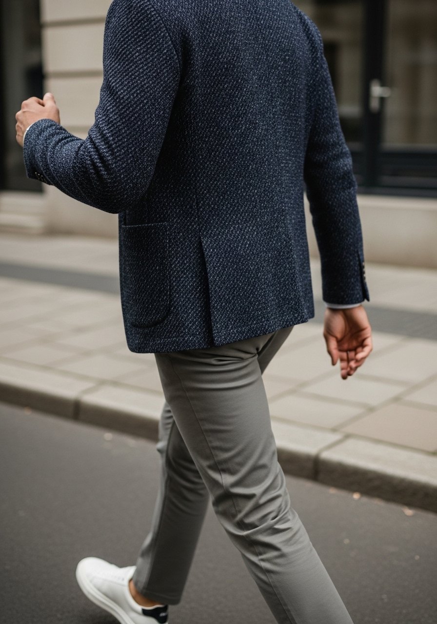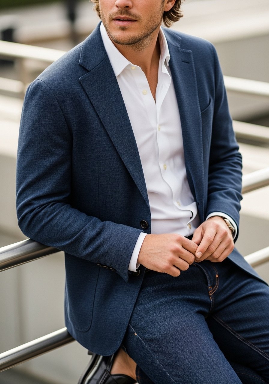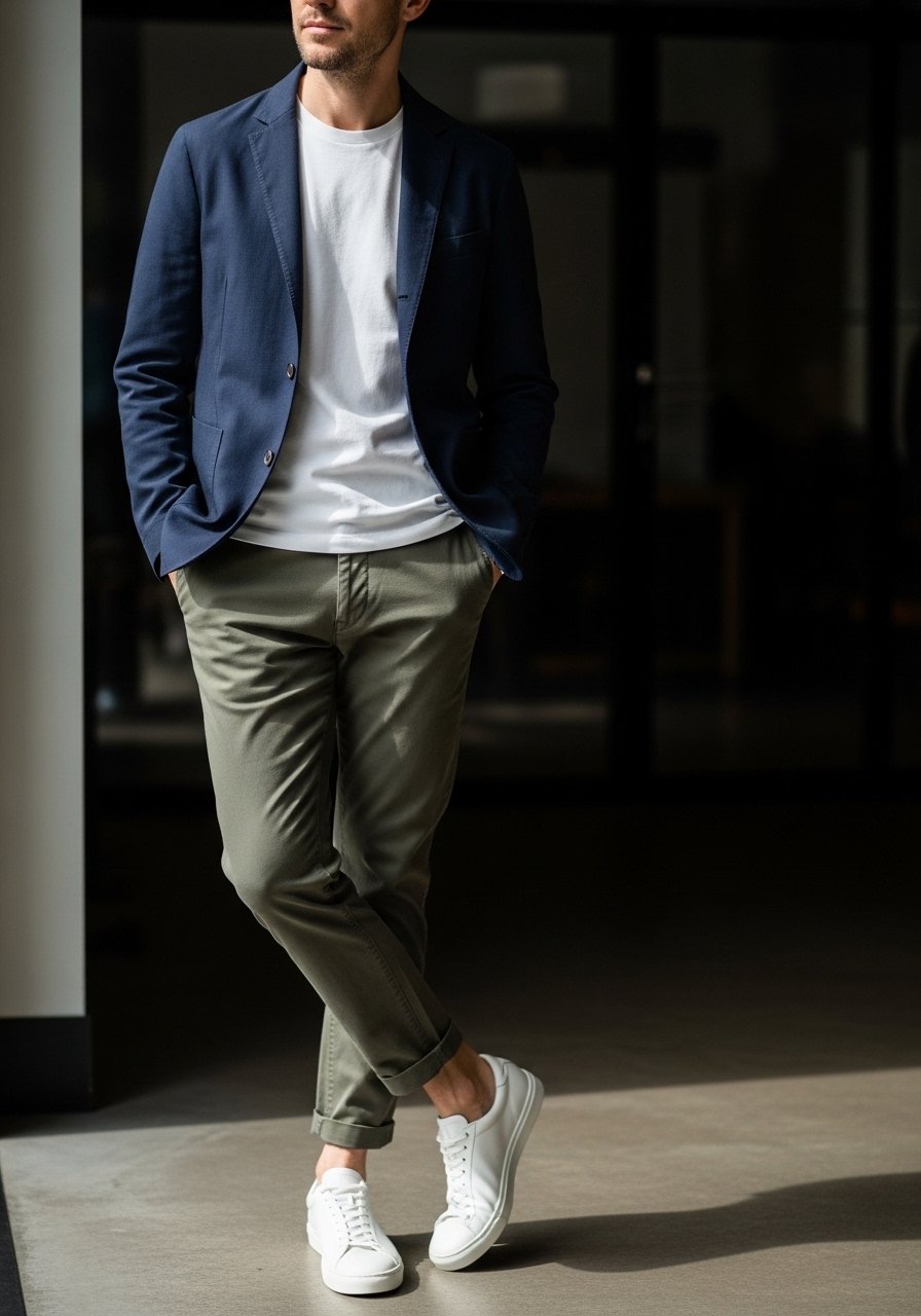 • Tee + blazer + chinos + white sneakers (relaxed but intentional).