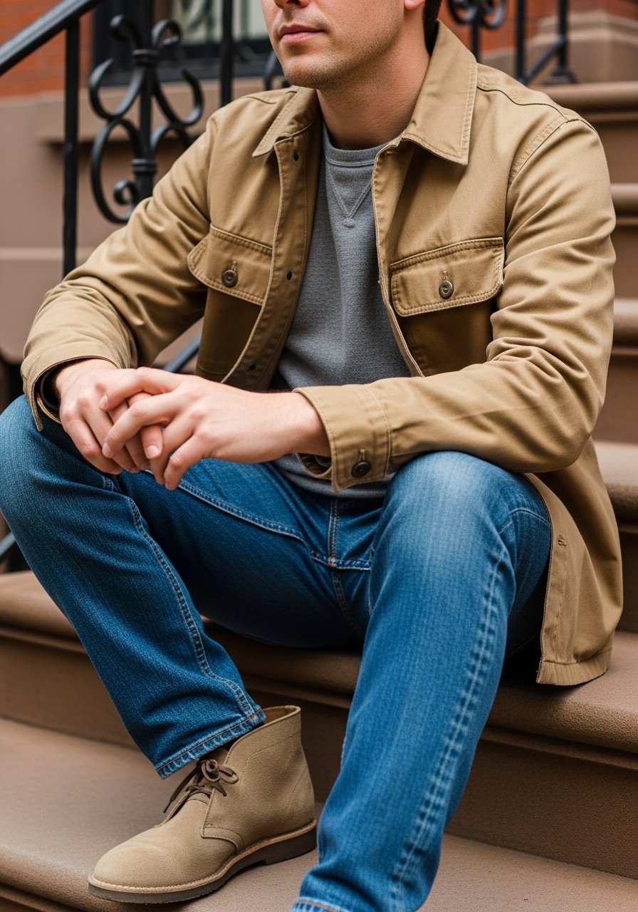Now I mix textures—cotton tee with denim and suede—to keep it interesting.