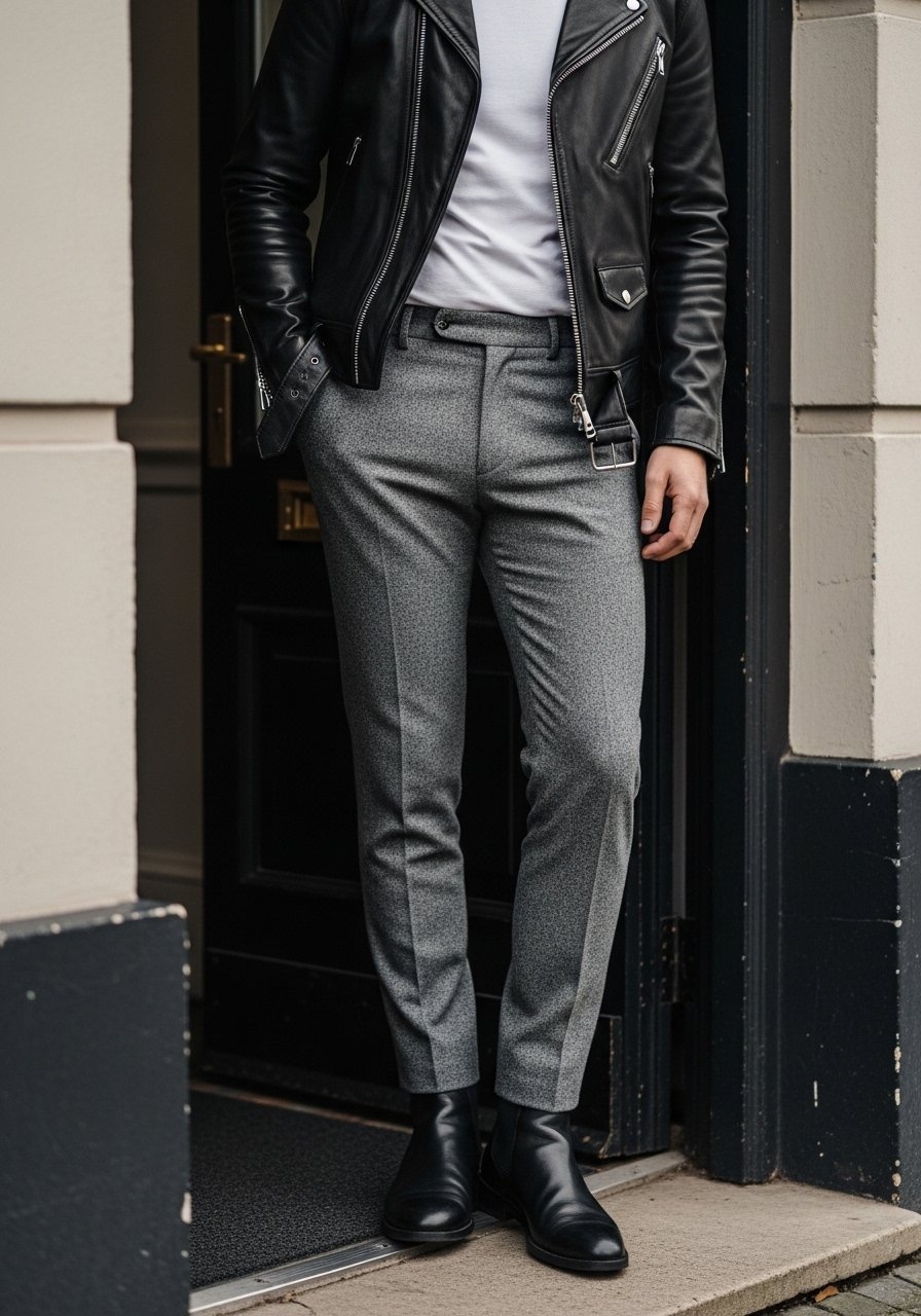 29. Elevated Casual: Leather Jacket, Tee, and Tailored Trousers