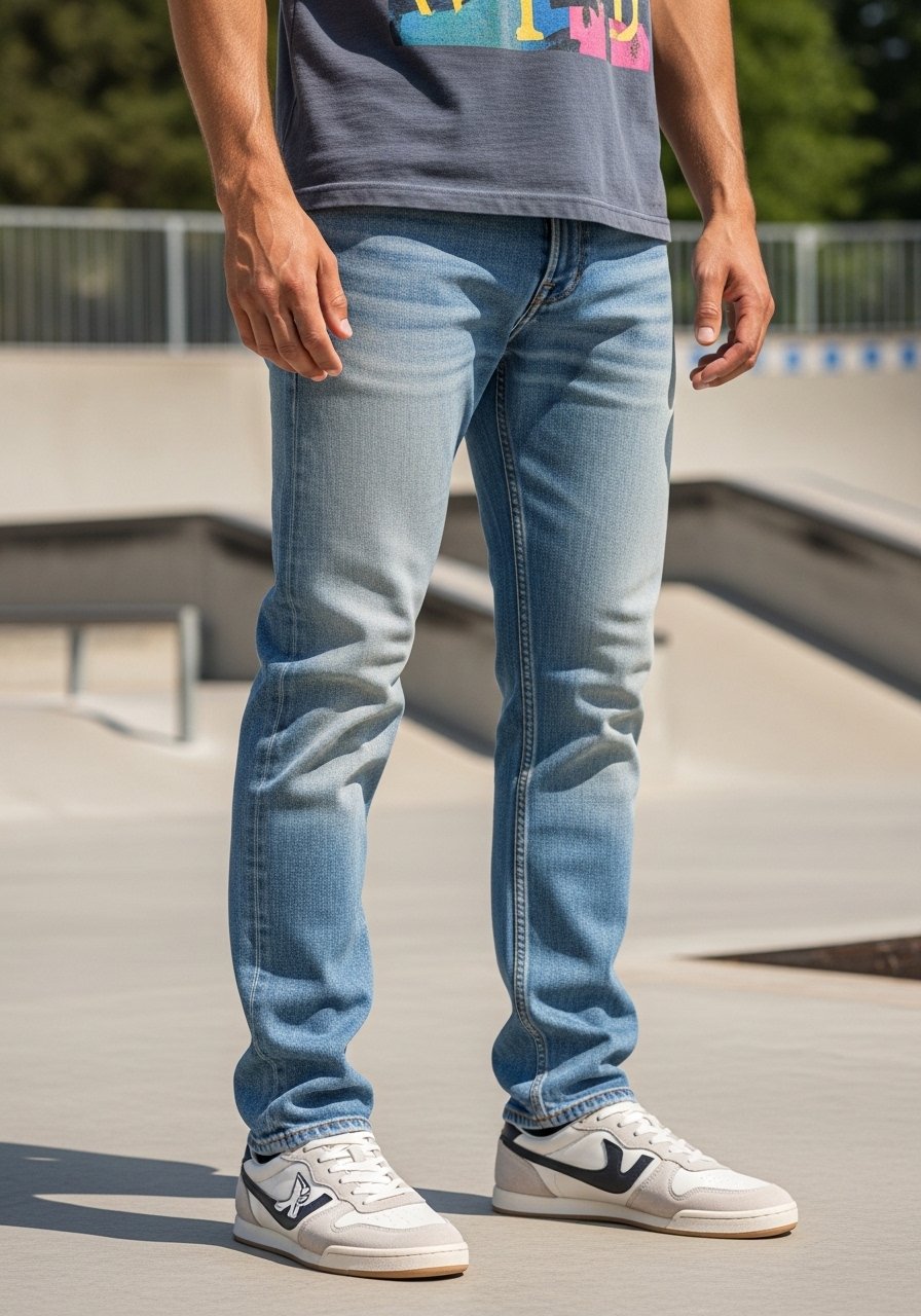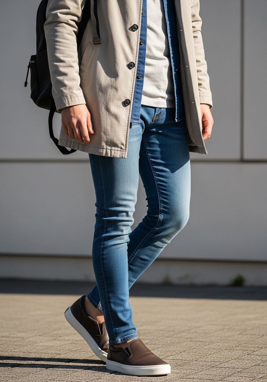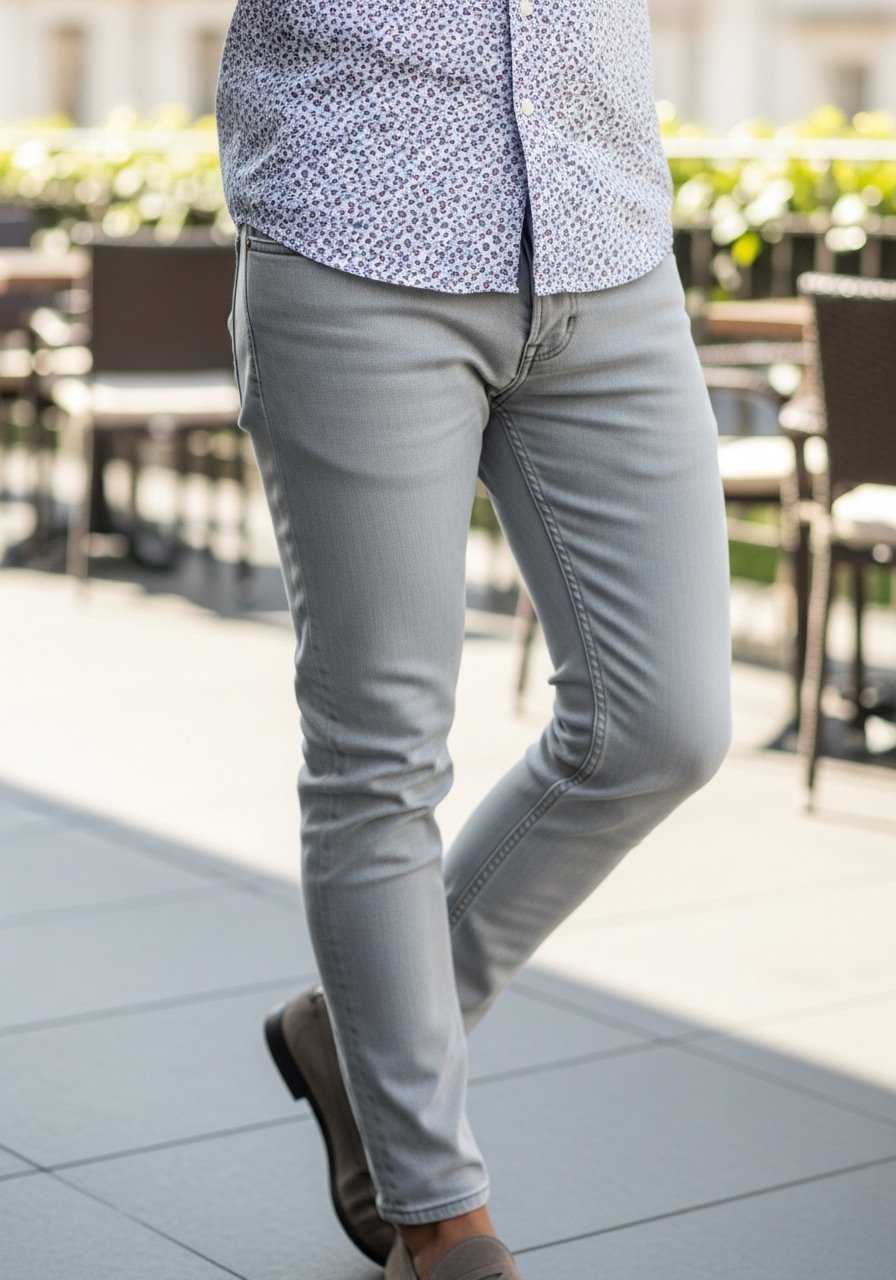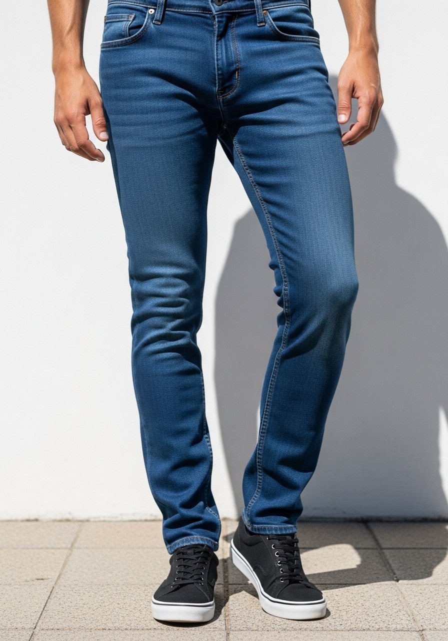 I choose slim-straight jeans or tailored chinos that fit my waist without pulling. The leg should skim the thigh and taper lightly toward the ankle.