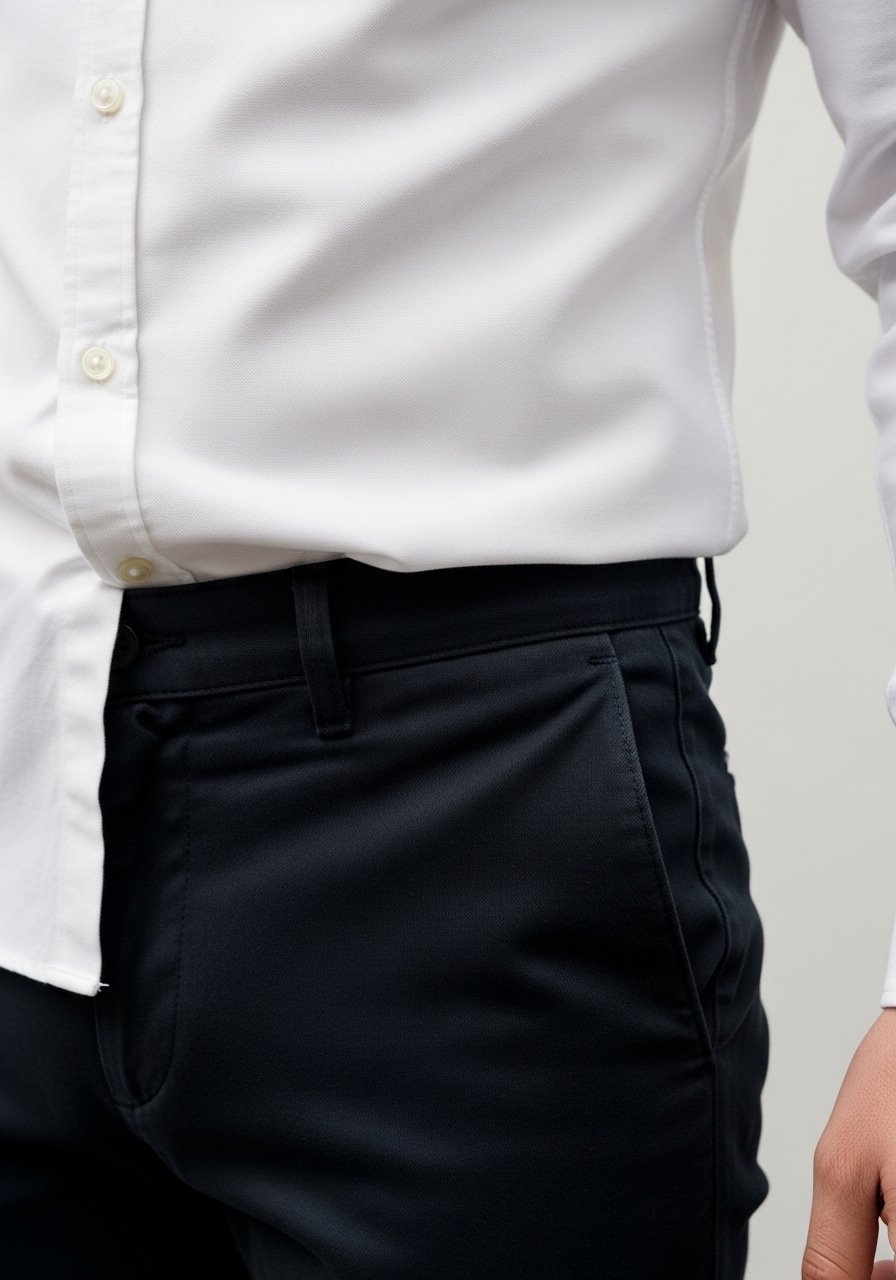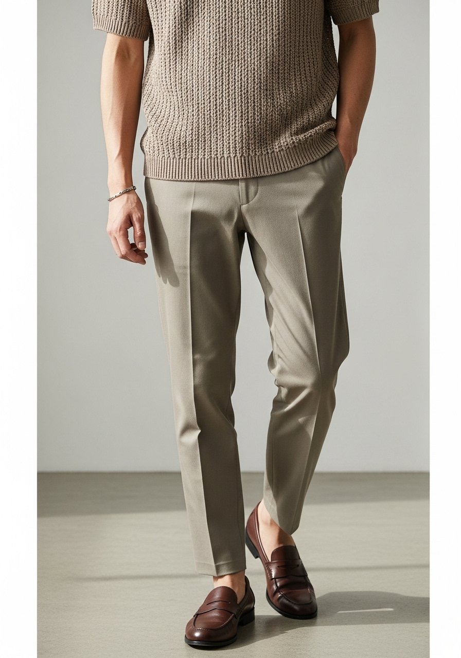 I begin with the shirt and pants because they set the silhouette. I want the shirt to skim the torso and the chinos to follow the line of my leg without clinging. Visually, this narrows the torso and lengthens the leg—my baseline for smart casual.