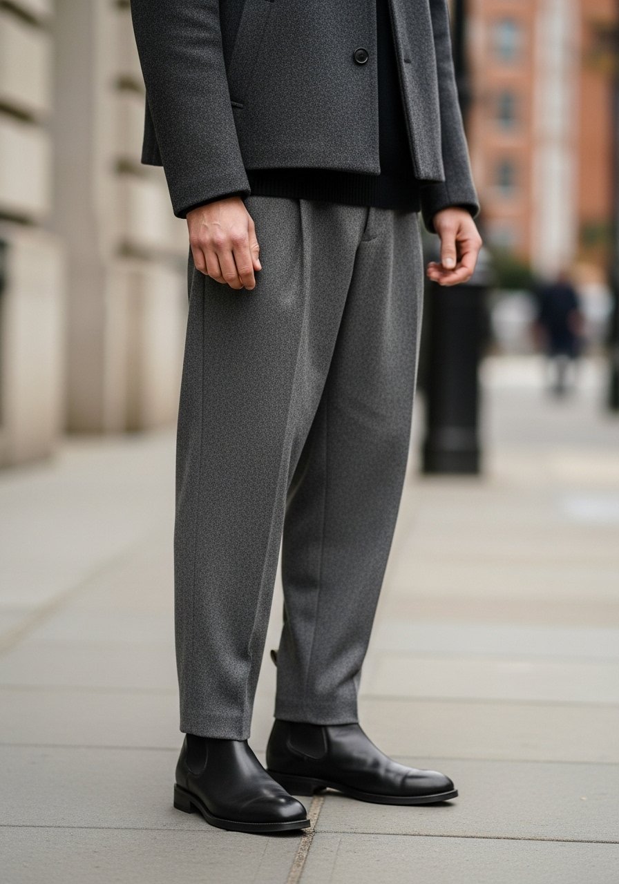 14. Short Coat, Relaxed Trousers, and Chelsea Boots