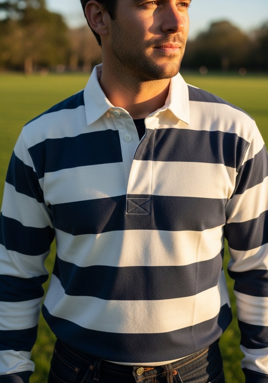 17. Rugby Shirt and Dark Jeans for Sporty-Casual Energy