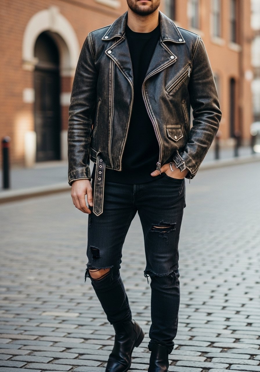 A leather jacket is timeless. I wear mine with a tee and tailored trousers when I want edge without casualness. It works for evenings and smart-casual events.