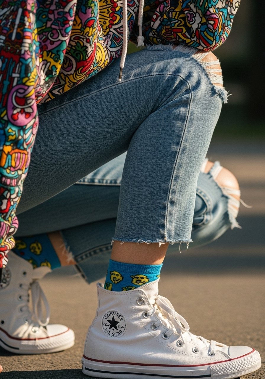 Retro sneakers finish the look with personality.