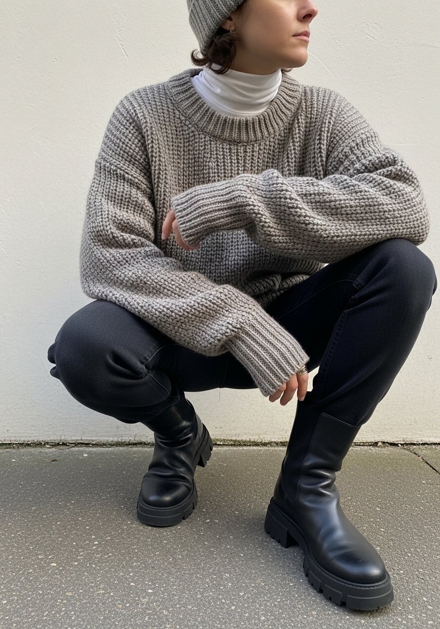 I once wore a chunky knit that swallowed me—so size down a touch for structure.